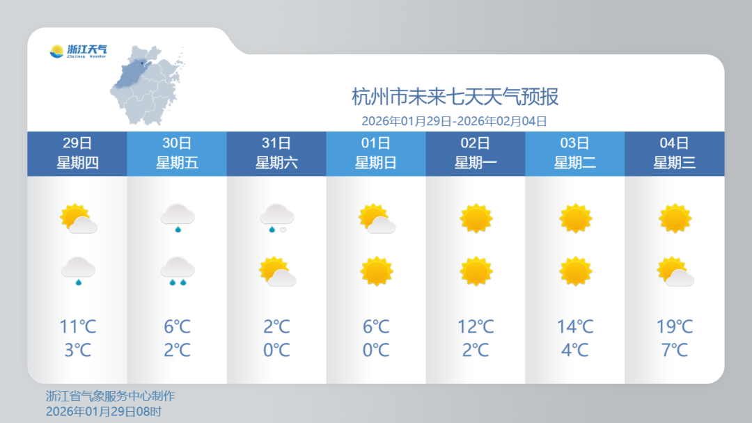 今天傍晚起雨:今天傍晚到夜里浙北部分地区率先下雨,雨势不大,小雨为主。明后天雨区范围扩大到全省,雨势也增大到中雨级别。