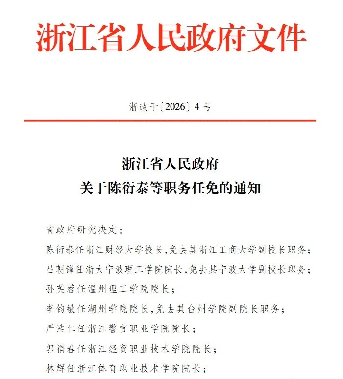 2月14日,浙江省政府官网发布《浙江省人民政府关于陈衍泰等职务任免的通知》。
