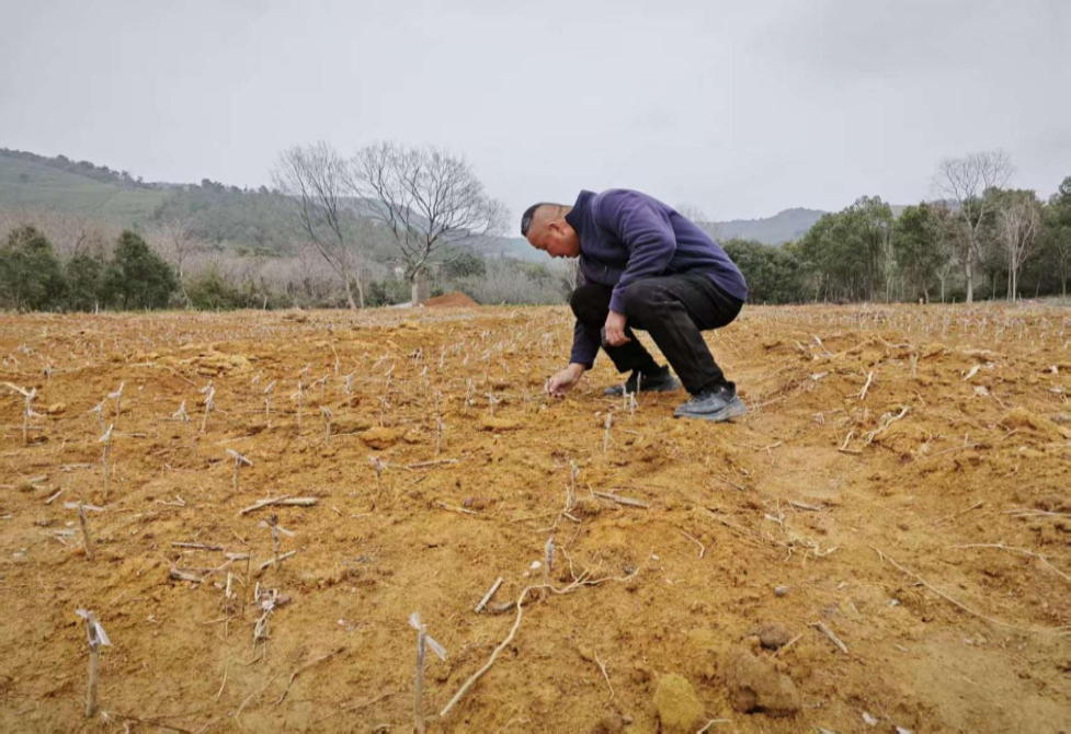 农户陈承年检查果苗扦插种植情况。