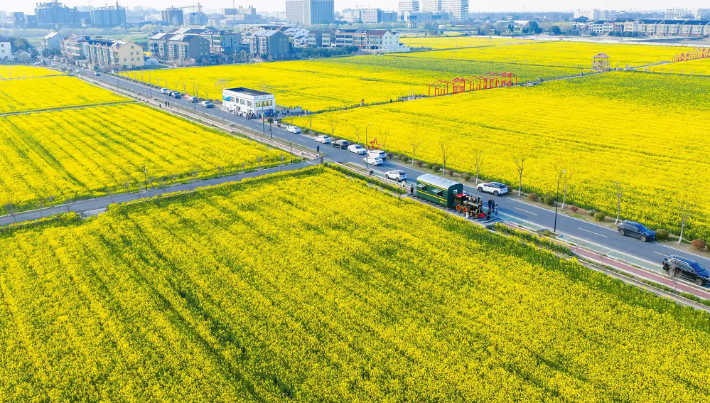 沿着三葛线行驶,豁然开朗处便是“田立方·临平未来农场”。千亩油菜花热烈绽放,金色田野如巨幅锦缎铺展,“四好农村路”如银色丝带穿梭其间,将花海分割成错落有致的几何图案。风吹过时,金浪翻滚,与远处碧空相接,美得让人忍不住停车驻足。