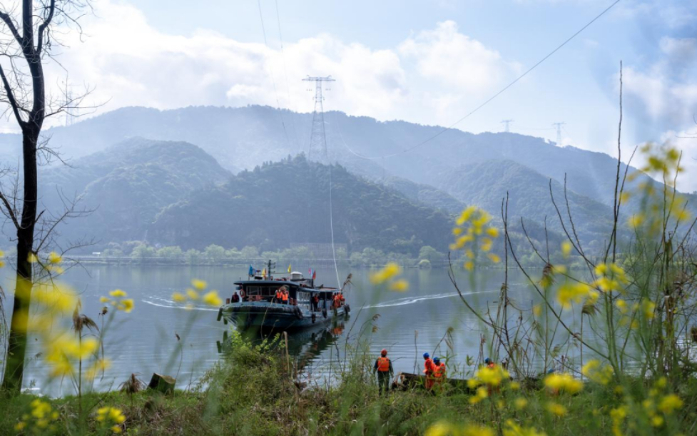 4月1日,在浙江杭州富春江西岸,一艘动力拖船拖着一根钢丝绳,缓缓驶向东岸的电力铁塔。这是“甘电入浙”特高压输电工程跨越富春江的作业现场,为明年建成投运奠定了基础。