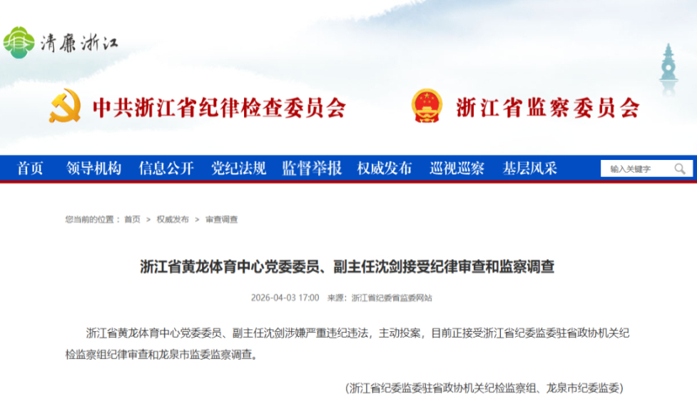 浙江省黄龙体育中心党委委员、副主任沈剑涉嫌严重违纪违法,主动投案,目前正接受浙江省纪委监委驻省政协机关纪检监察组纪律审查和龙泉市监委监察调查。