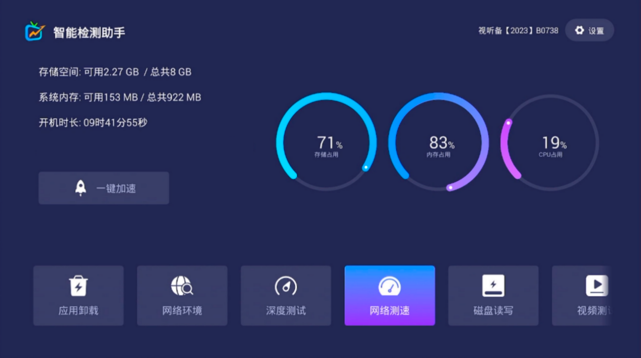 智能排障助手如同为机顶盒安装了一套健康监测系统。它实时关注设备的内存占用、CPU负载、硬盘寿命、运行温度等关键指标,能够自动识别因软硬件性能不足导致的卡顿、黑屏、无法开机等异常。当检测到系统缓存堆积或后台进程过多时,助手提供“一键加速”“一键卸载”等简易操作,帮助用户快速释放存储空间、清理无用资源,恢复流畅的操作体验。针对老旧机顶盒常见的磁盘老化问题,助手能够精准评估读写性能与剩余寿命,为提前更换故障设备提供科学依据,有效延长终端使用周期。
