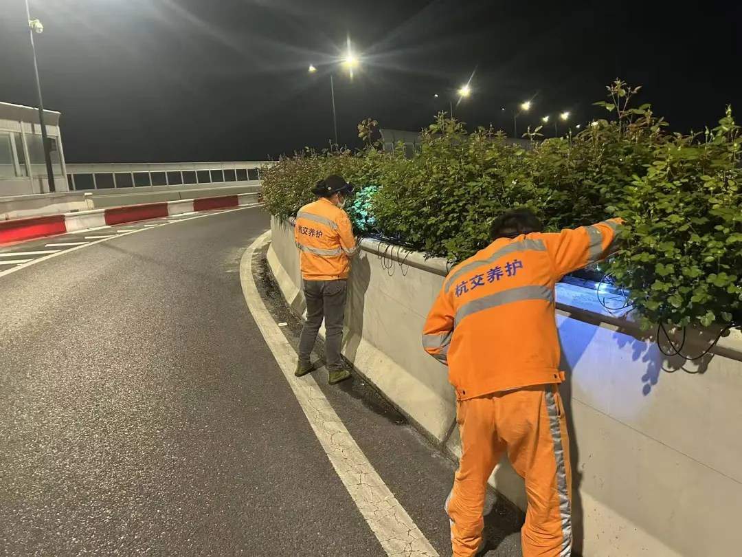 为了不打扰日间车流穿梭,不影响市民出行,所有精细化养护都藏在了夜色里。灯火通明的作业车旁,养护工人的身影在夜色中格外显眼,每一个动作都一丝不苟,每一处细节都用心呵护,用坚守为高架月季的盛放保驾护航。